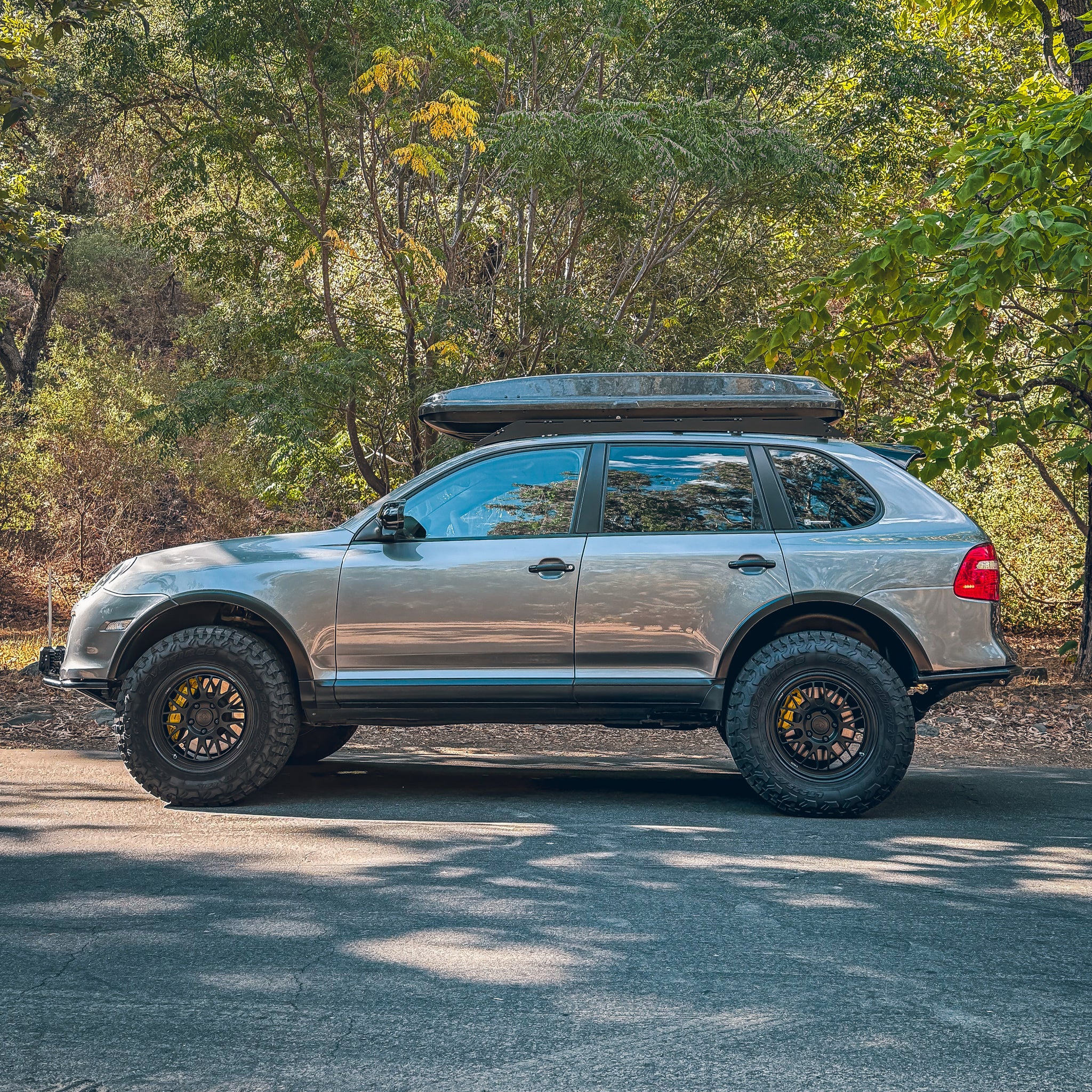 We believe we created an awesome roof rack specifically for the 1G Cayenne/Touareg. The modular cross bars allows a multitude of accessories to mount or attach to the rack. The roof rack is made from strong 6061 aluminum including the wind deflector and strong steel brackets. We offer a standard wind deflector or a light bar version that is cut out to handle up to a 42” light bar.